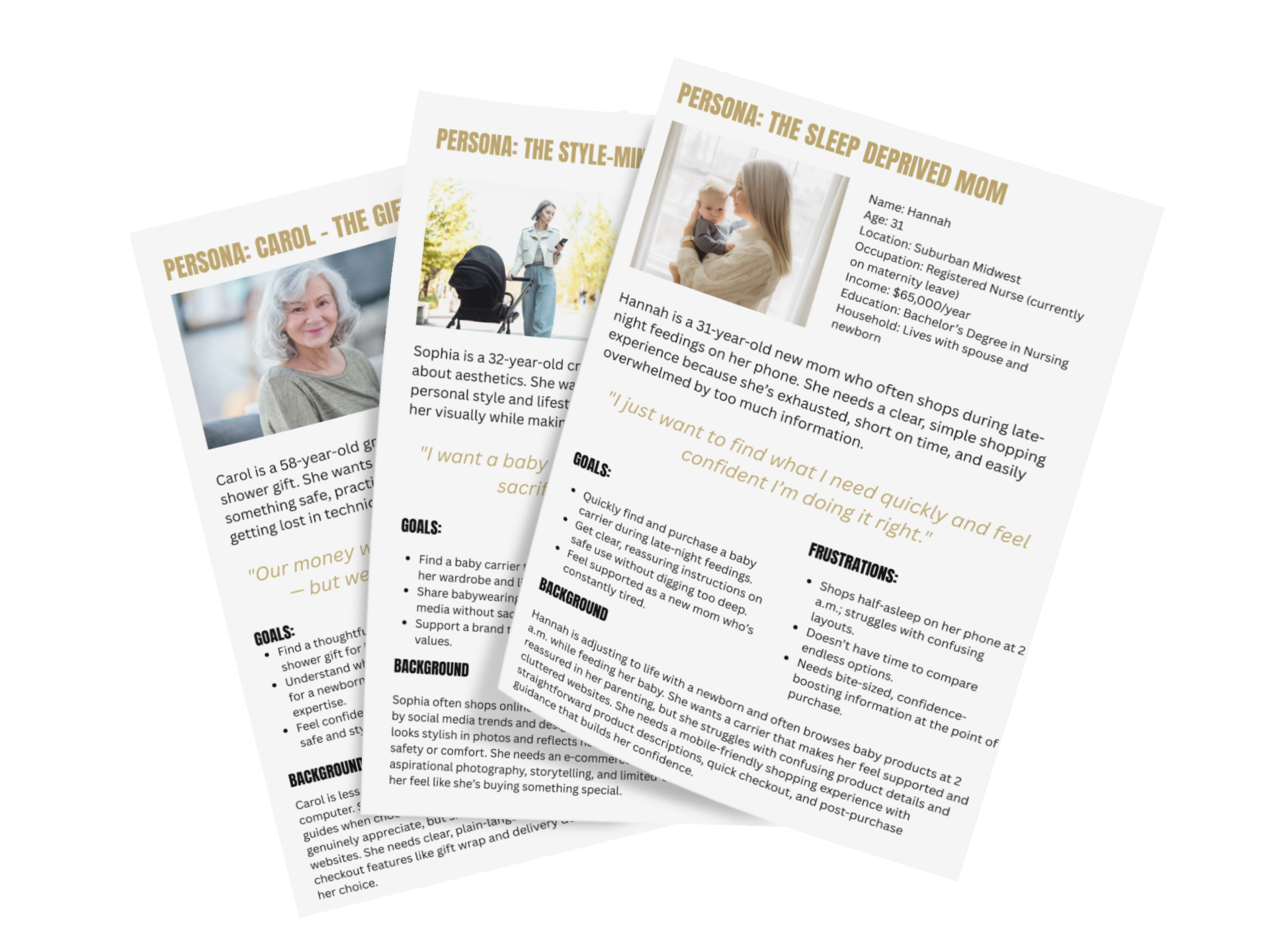Designing for Beespoke taught me to prioritize user needs over assumptions. Through user personas, journey mapping, and problem statements, I learned how to frame the design challenge around parents seeking both functionality and style in baby carriers.
